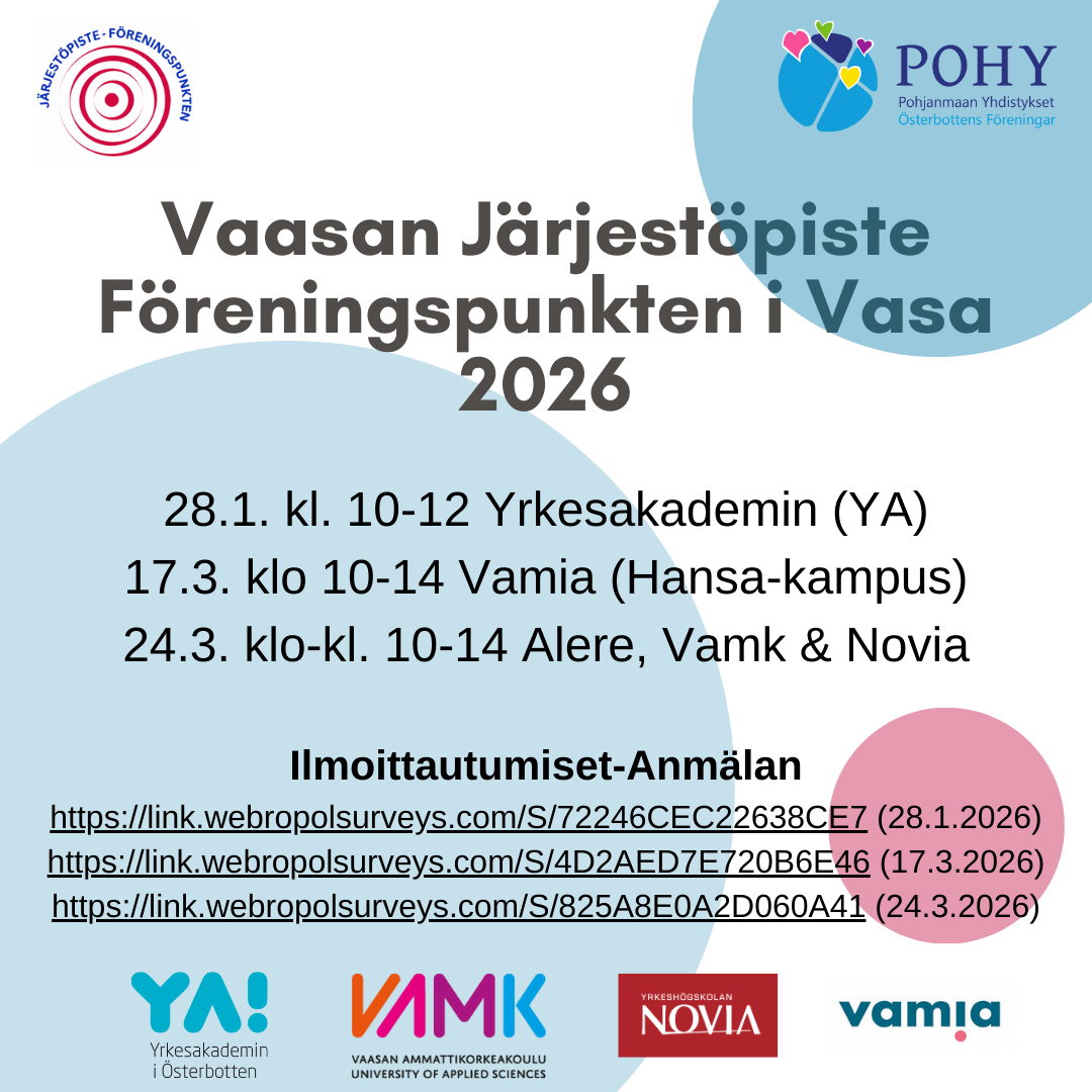 Ilmoittautumiset | Anmälan https://link.webropolsurveys.com/S/72246CEC22638CE7 (28.1.2026) https://link.webropolsurveys.com/S/4D2AED7E720B6E46 (17.3.2026) https://link.webropolsurveys.com/S/825A8E0A2D060A41 (24.3.2026)